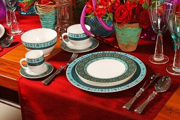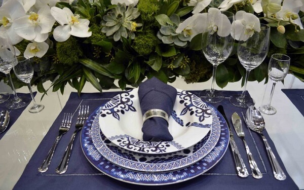 Em uma mesa posta para jantar ou almoço, a disposição das louças e talheres devem seguir as regras básicas de etiqueta como os garfos à esquerda e facas, colheres e taças à direita dos pratos. Coloque a colher de sobremesa sempre à frente do prato.