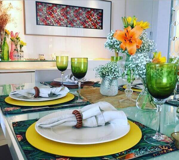 Na mesa posta para jantar ou almoço informal foi utilizado um jogo americano amarelo e branco com guardanapos contrastantes. As louças brancas com estampas coloridas completam o visual alegre e descontraído.
