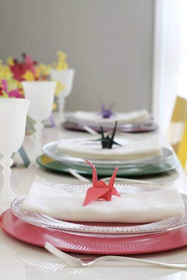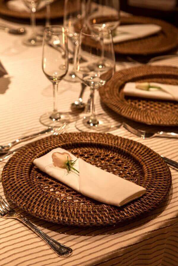 O sousplat é uma peça que pode ser feita em louça, tecido, madeira ou metal para proteger a mesa da temperatura dos pratos. A mesa posta com sousplat na sala de jantar fica com uma apresentação muito elegante, pois realça a louça e a toalha.