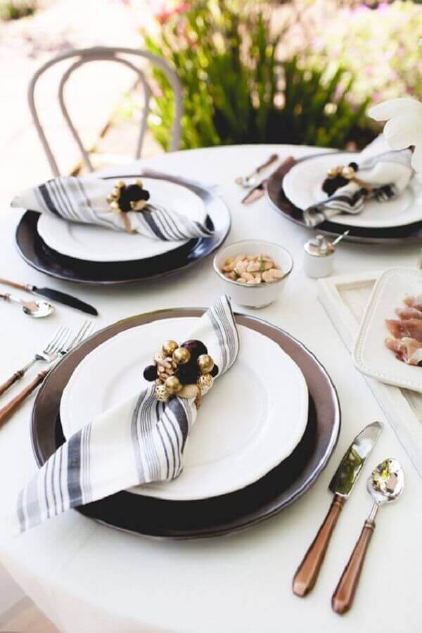 Na mesa posta com sousplat de madeira, os talheres dourados e as taças com frisos combinam perfeitamente com o tom da toalha. As louças brancas apresentam detalhes pequenos em  marrom para acompanhar a cor do sousplat.