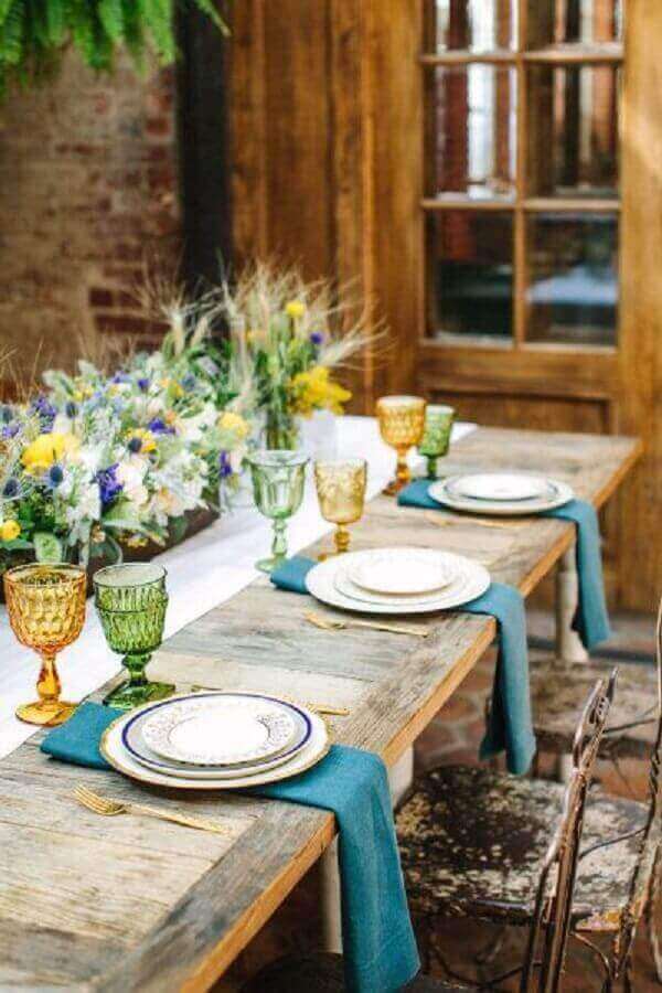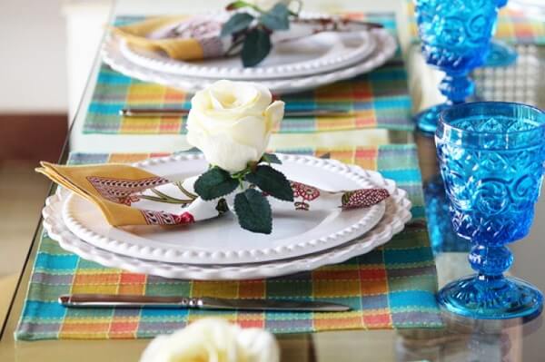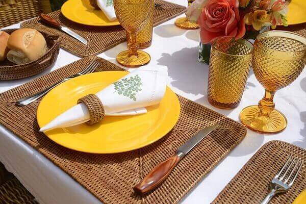 Os jogos americanos de tecidos coloridos ou confeccionados com bambus também são excelentes opções para decorar a mesa.  É importante ressaltar que os talheres para churrasco são próprios para carnes vermelhas. Opte por louças temáticas e copos para cerveja.