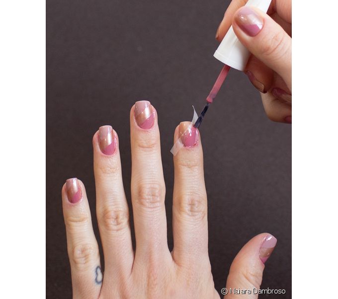 4. Feito isso, aplique o esmalte rosa na metade de baixo da unha – logo abaixo da fita adesiva, rente à cutícula;
