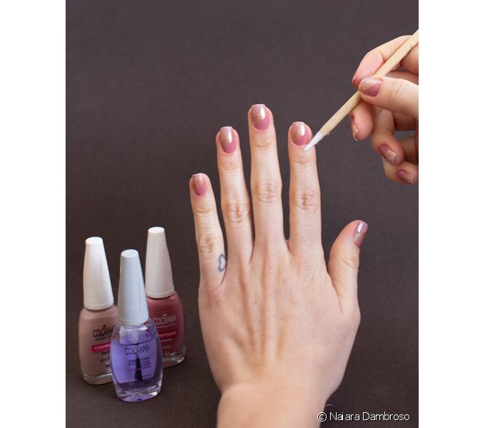 7. Agora, limpe todos os borrões nos cantinhos dos dedos usando o palito de laranjeiras com algodão embebido em removedor de esmalte;