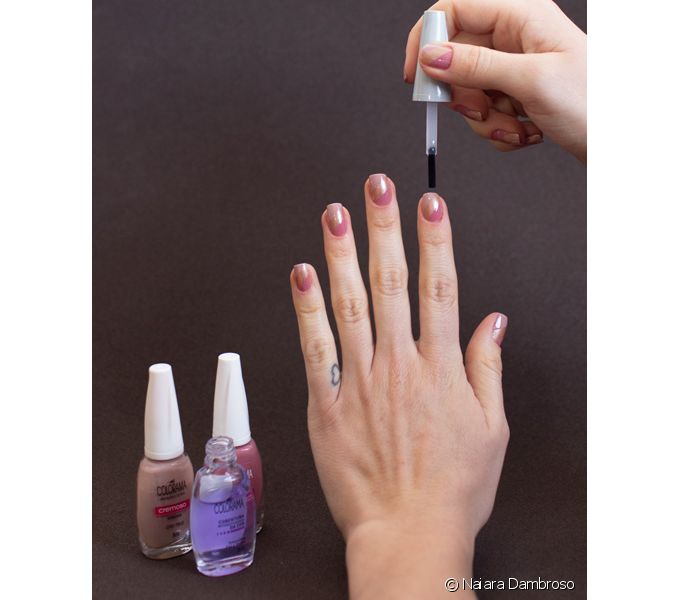 2. Em seguida, aplique duas camadas do esmalte nude cintilante nas unhas;