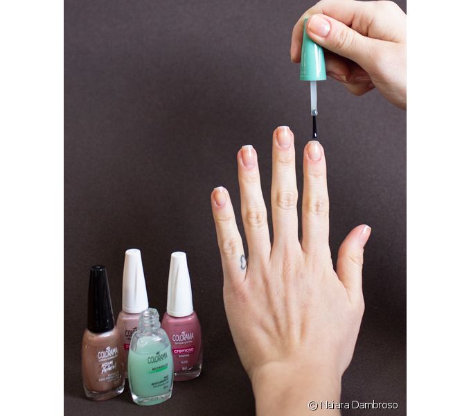 1. Com as unhas cuticuladas e/ou hidratadas, comece a esmaltação usando a base de nutrição e nivelamento em todas as pontinhas dos dedos;