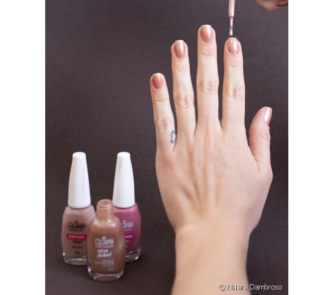 2. Em seguida, aplique duas camadas do esmalte nude cintilante nas unhas;