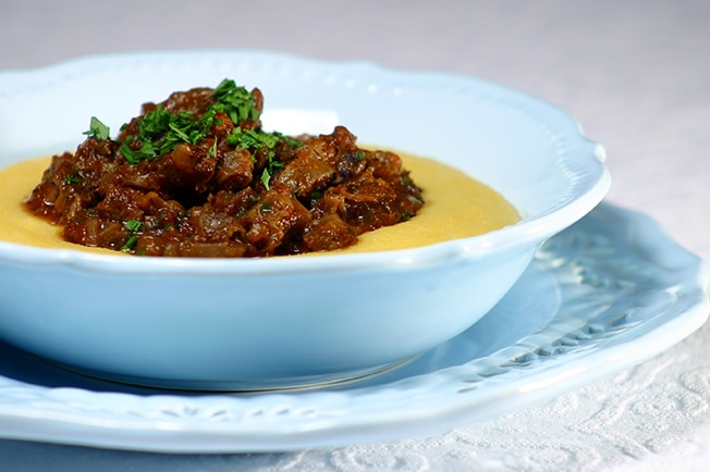 - Servir com o ragu de carne e finalizar com o queijo parmesão e o ramo de tomilho.
