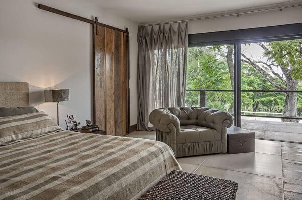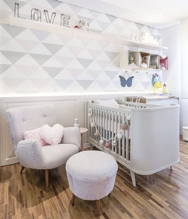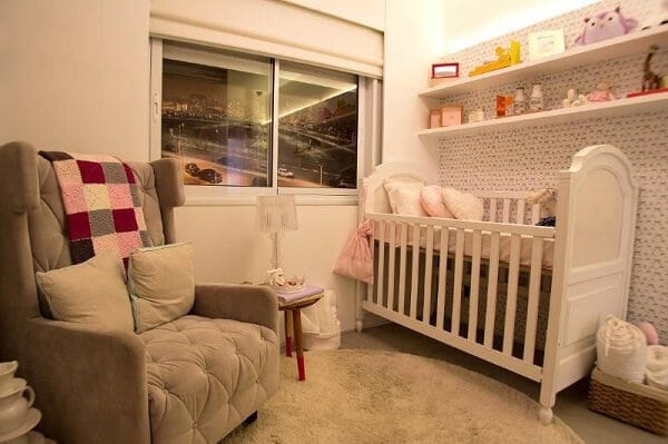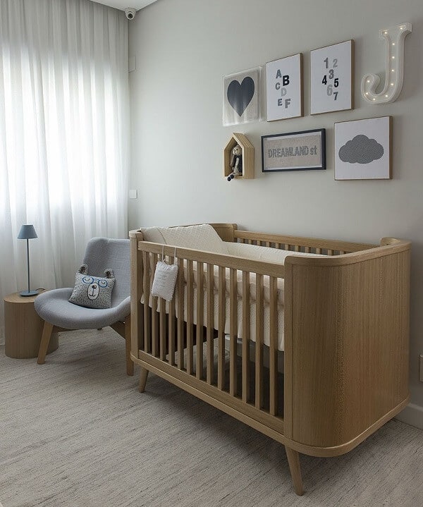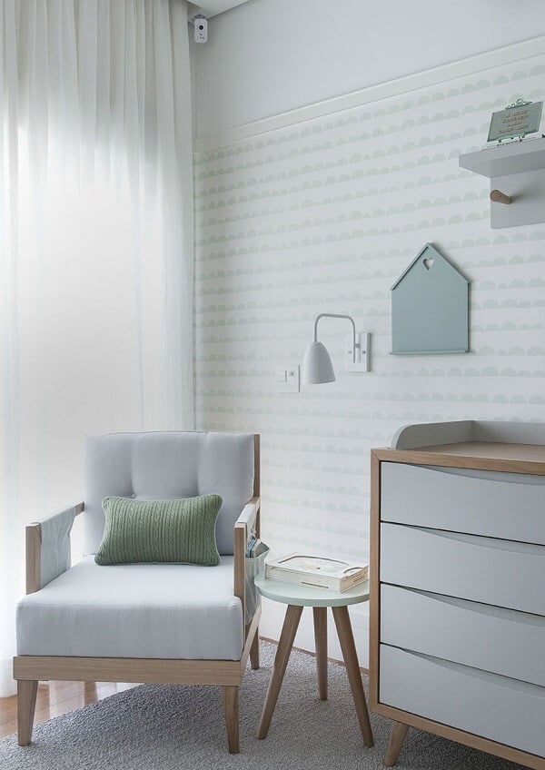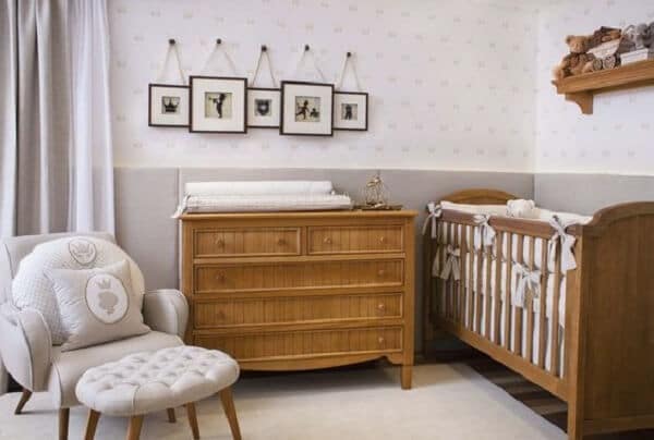 No projeto decorativo abaixo, os moradores seguiram um estilo rústico com detalhes em tom neutro. Observe como a poltrona cinza de amamentação combinou perfeitamente com a cômoda, berço e prateleira de madeira.