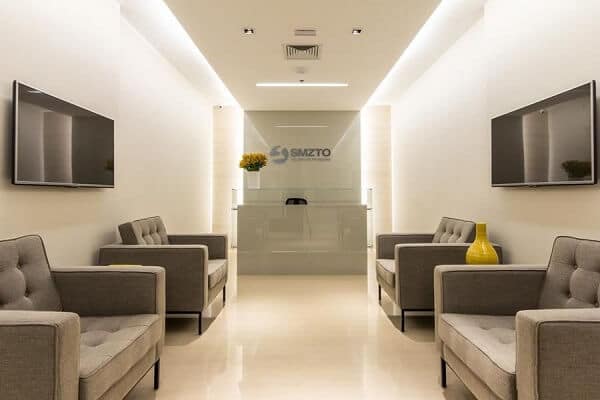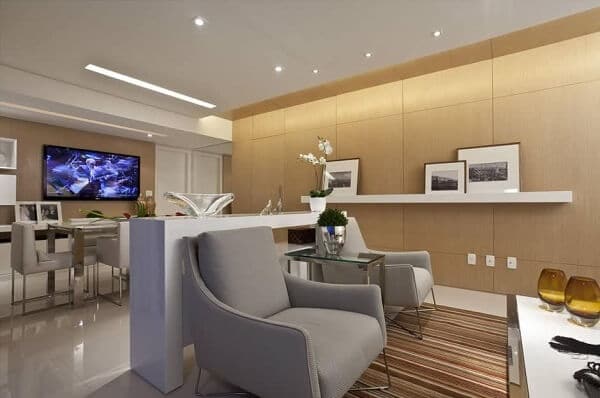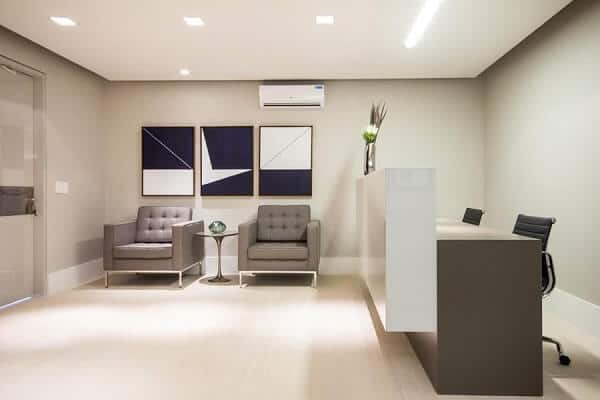No estabelecimento comercial ou escritório, o tom cinza pode também prevalecer na decoração. No projeto abaixo, a sala de recepção recebeu a presença de quatro poltronas em tom cinza, uma estrutura de painel e mesa feito com vidro jateado. A sanca de gesso no teto trouxe uma iluminação pontual na laterais do espaço e o piso e paredes em tom branco realçaram um ar de limpeza no local.