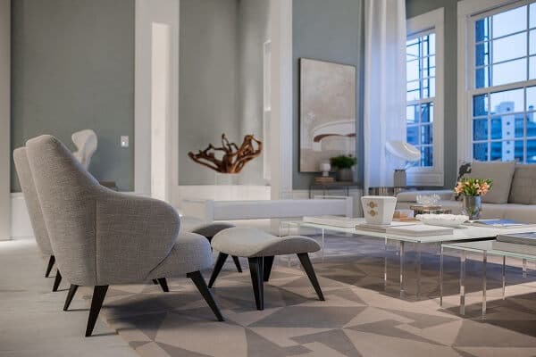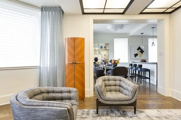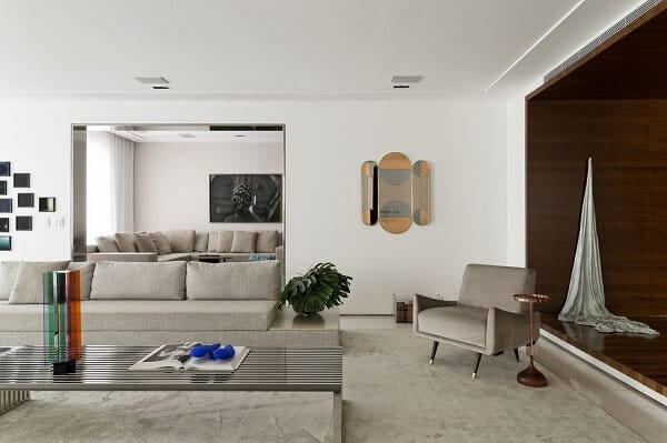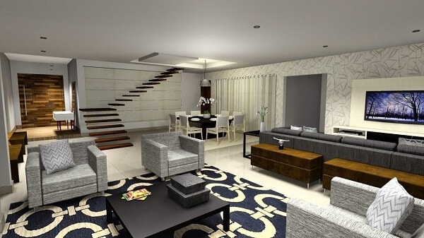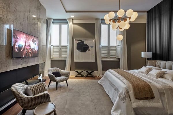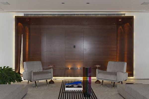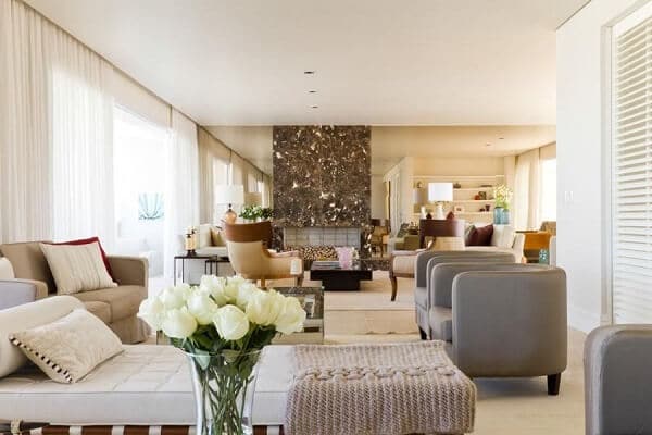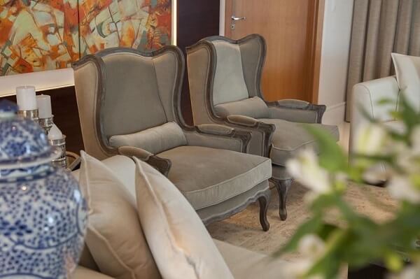 No projeto decorativo abaixo, os moradores optaram por incluir modelos de poltrona para sala cinza. Observe que a presença das duas poltronas trouxe ainda mais sofisticação ao ambiente, realçando o estilo clássico do cômodo. Aqui, as poltronas além de trazerem conforto ao espaço, serviram para preencher o espaço na sala de estar ampla.