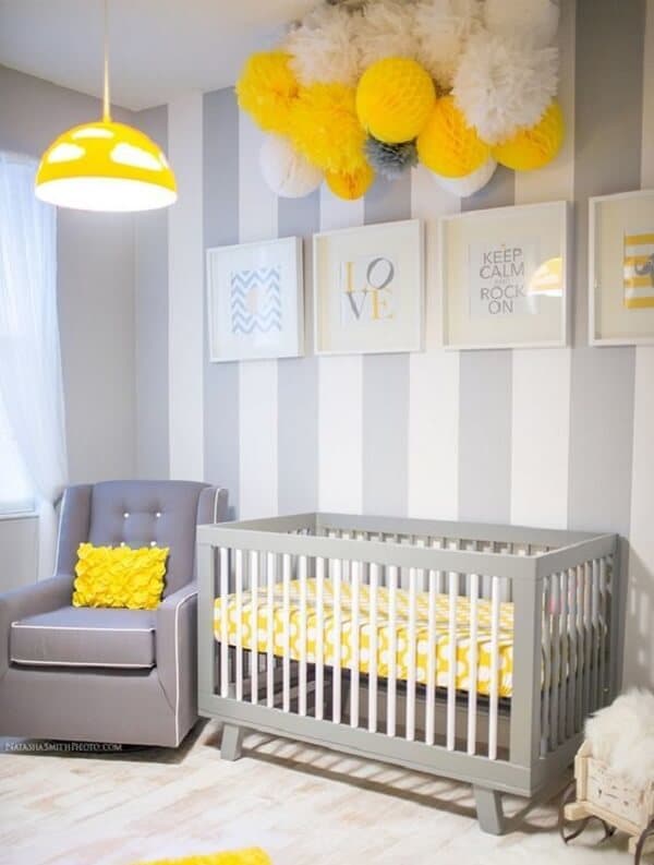 Agora, para as mamães que desejam incluir uma cor mais viva no quarto de bebê, saiba que a versatilidade da tom cinza permite essa mistura. No quarto de bebê abaixo, a cor amarela foi escolhida como tom de destaque enquanto a tonalidade cinza e branco foi utilizada como cores complementares no ambiente.