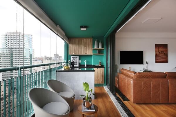 Como já mencionado a cor cinza por servir como pano de fundo na decoração de um ambiente ela pode facilmente combinar também com outras tonalidades mais vivas. Na imagem abaixo, a varanda gourmet com teto e parede verde e chão com piso laminado recebeu a presença de dois modelos de poltrona cinza claro.