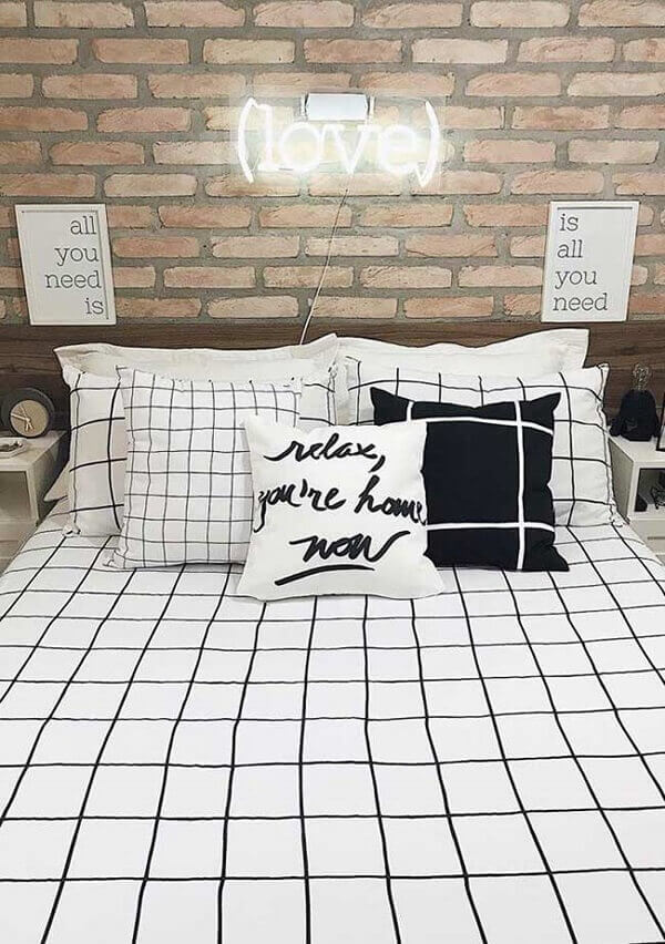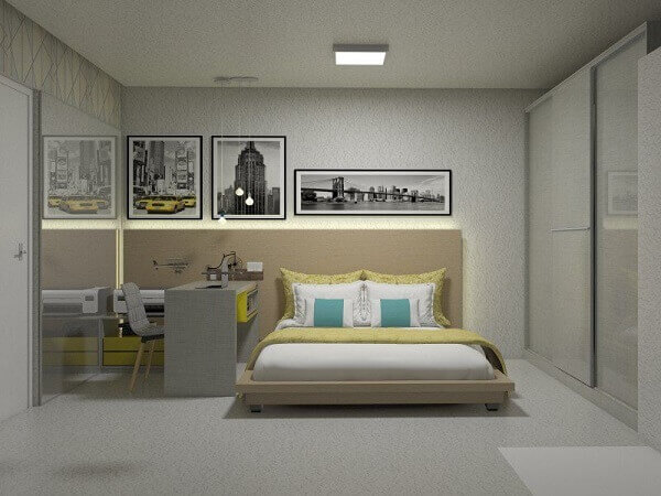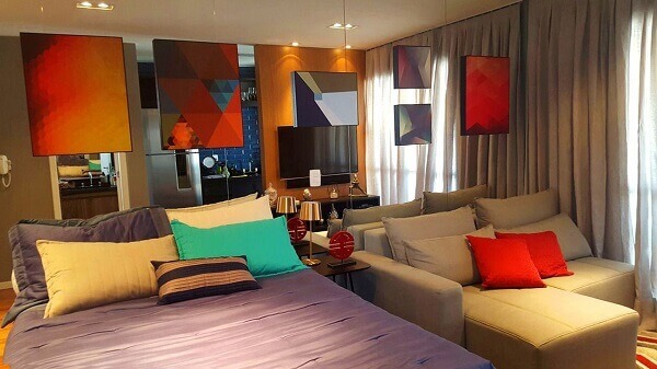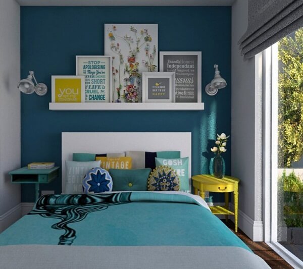 As cores das cortinas, madeira dos móveis, roupas de cama e até mesmo da imagem dos quadros precisam combinar entre si e também com os enfeites para quarto.