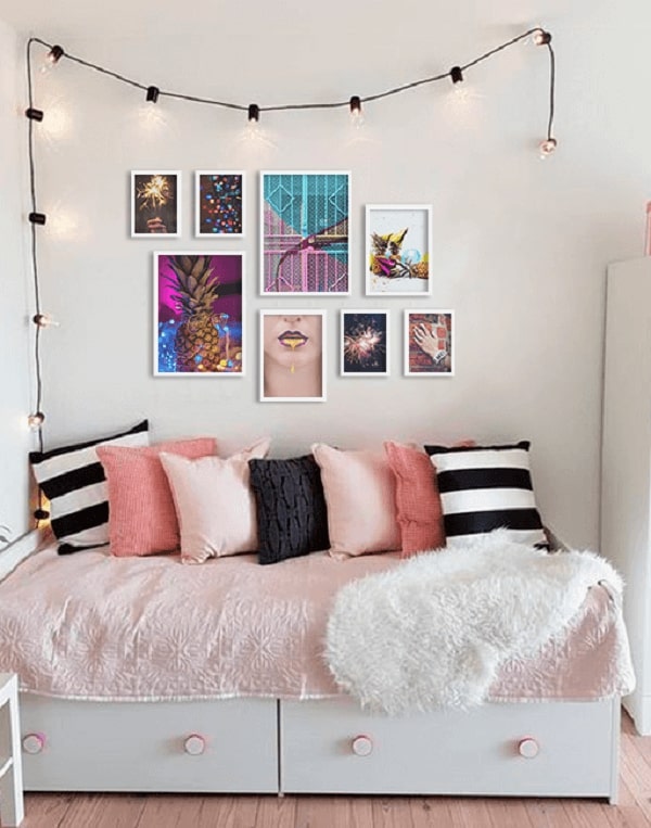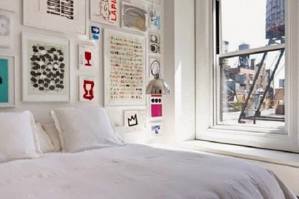 Para você que deseja fazer uma parede de quadros em seu dormitório é preciso dimensionar os tamanhos, as alturas e proporções. Após definir as figuras da parede de quadros, observe as molduras possíveis para que você possa harmonizar com os móveis e outros objetos.