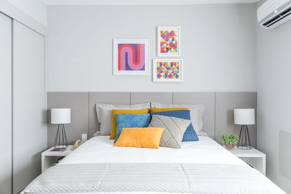 Quando você pendurar os quadros para quarto, procure deixá-los a uma altura de 1,60m ou forme conjuntos de quatro ou mais peças em formato quadrado.