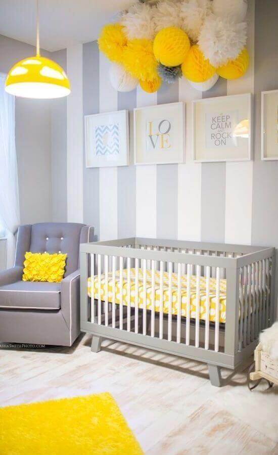 Porém, também há a possibilidade de usar tons mais claros e delicados de amarelo, assim como foi feito na decoração de quarto cinza e amarelo da foto abaixo. Nesse quarto de bebê o cinza foi usado na maior parte do ambiente, já o amarelo foi escolhido em uma tonalidade clara e delicada onde ele proporcionou um quarto cinza e amarelo bem delicado e aconchegante.