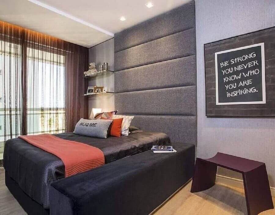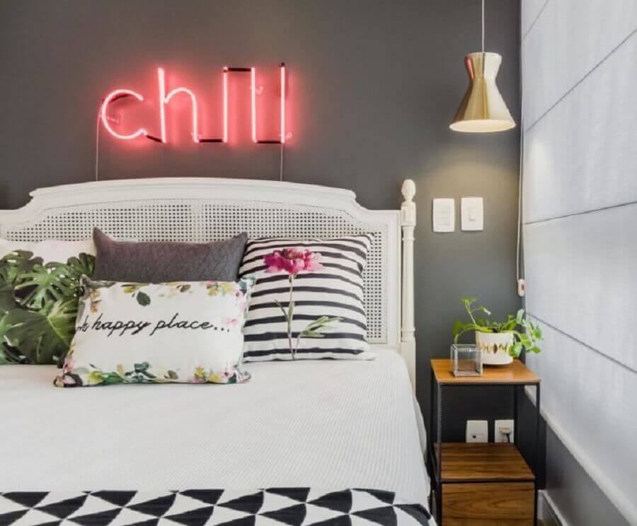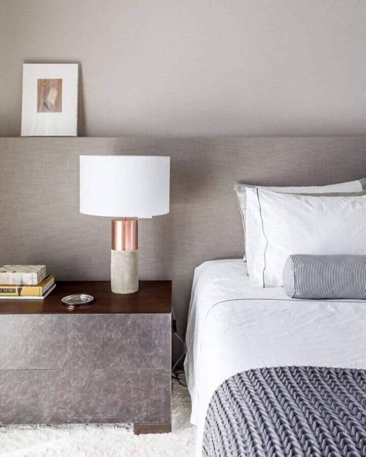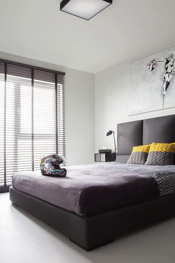 Para colocar um toque de cor na decoração de quarto cinza e branco é válido investir em objetos decorativos como almofadas estampadas, quadros, abajures entre outros, já se você prefere algo mais clean, porém quer levar esse toque mais aconchegante para a decoração de quarto cinza e branco invista em acabamentos em madeira ou mesmo no cimento queimado.