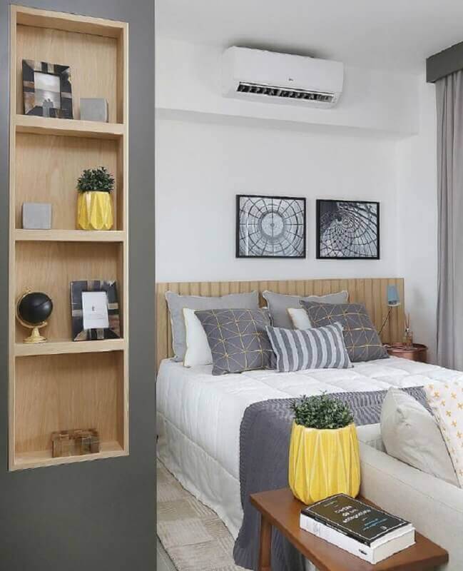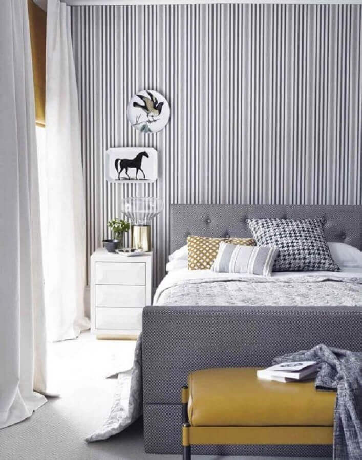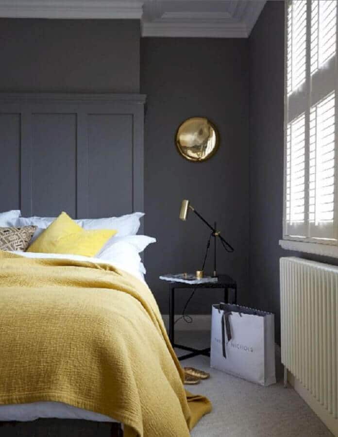 No quarto cinza e amarelo é bem comum que a cor mais viva do amarelo fique nos detalhes decorativos do ambiente como roupa de cama, nichos, objetos de decoração entre outros, pois como essa cor é muito chamativa é mais interessante que ela seja usada em uma quantidade menor nesse ambiente que procuramos quando precisamos relaxar.