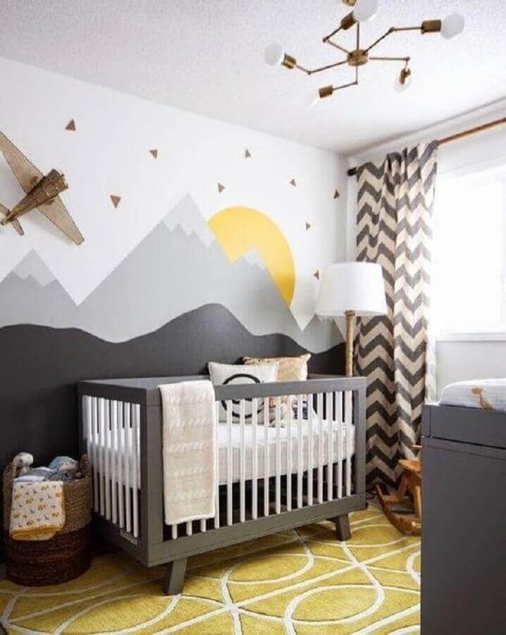 Porém, também há a possibilidade de usar tons mais claros e delicados de amarelo, assim como foi feito na decoração de quarto cinza e amarelo da foto abaixo. Nesse quarto de bebê o cinza foi usado na maior parte do ambiente, já o amarelo foi escolhido em uma tonalidade clara e delicada onde ele proporcionou um quarto cinza e amarelo bem delicado e aconchegante.