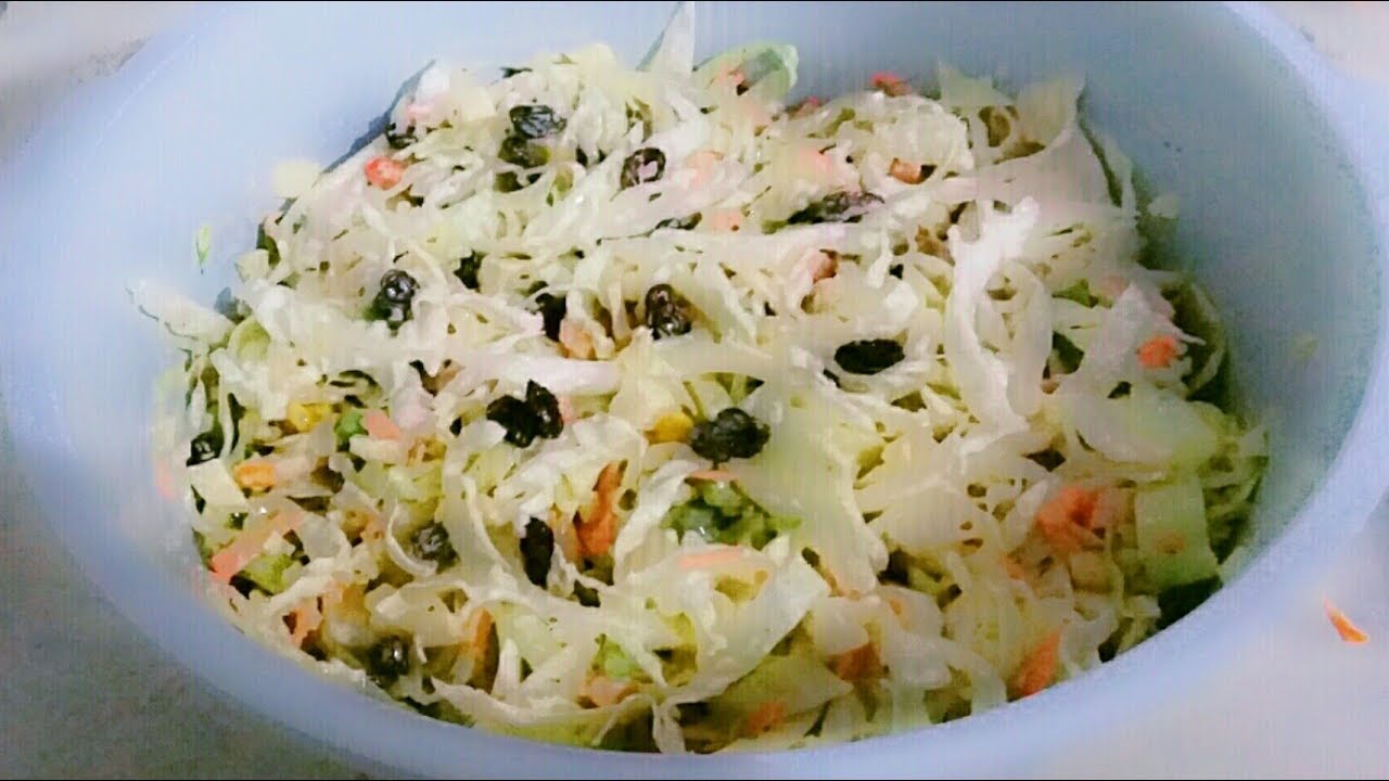 Basta fatiar 1/2 repolho (usei um bem pequeno), juntar 1 maçã picadinha, um punhado de uvas passas, temperar com sal pimenta, azeite (o temperinho que você usa sempre em saladas).