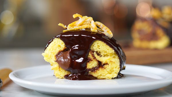 - Pincelar com o suco de meia laranja e cobrir com o creme de avelã. Enrolar com cuidado ainda quente.