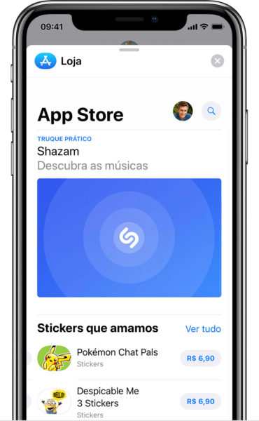 Para navegar pelos outros aplicativos disponíveis, basta tocar na Loja e ver as criações mais delirantes possíveis de desenvolvedores do mundo todo. Alguns dos apps são gratuitos; outros têm compras internas ou são pagos. Para baixá-los, basta tocar no botão “Obter” ou no botão com o preço do aplicativo; depois de entrar com o seu ID Apple, o app será baixado e irá para a gaveta.