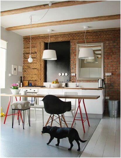 Se você está “louca” para montar uma sala de jantar no estilo industrial, a mesa cavalete é definitivamente perfeita para você. Use o cavalete de ferro para mesa, que é ainda mais no estilo, e escolha cadeiras diferentes para fazer parte do conjunto, como feito na foto abaixo.