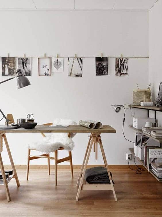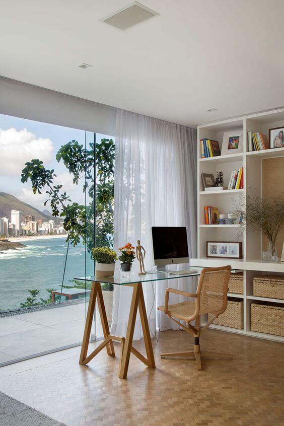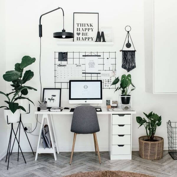 Dica especial: Prefira cores claras e que sejam a sua cara para compor o escritório. A mesa cavalete branca, por exemplo, assim como as cores neutras, são perfeitas para isso. Também repare que o escritório foi decorado com plantas para ser ainda mais relaxante e agradável.
