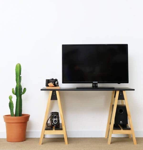 Você precisa de uma rack para sala de estar? Uma opção é usar a mesa cavalete. Para dar certo, no entanto, você precisa de cavaletes menores, na altura que seja mais adequado para colocar a televisão.