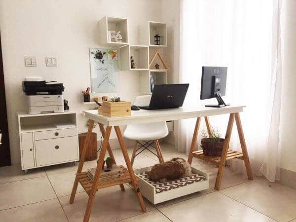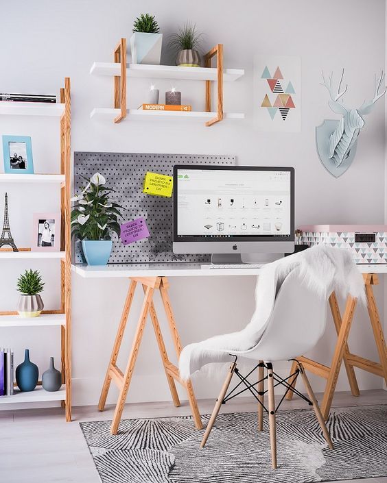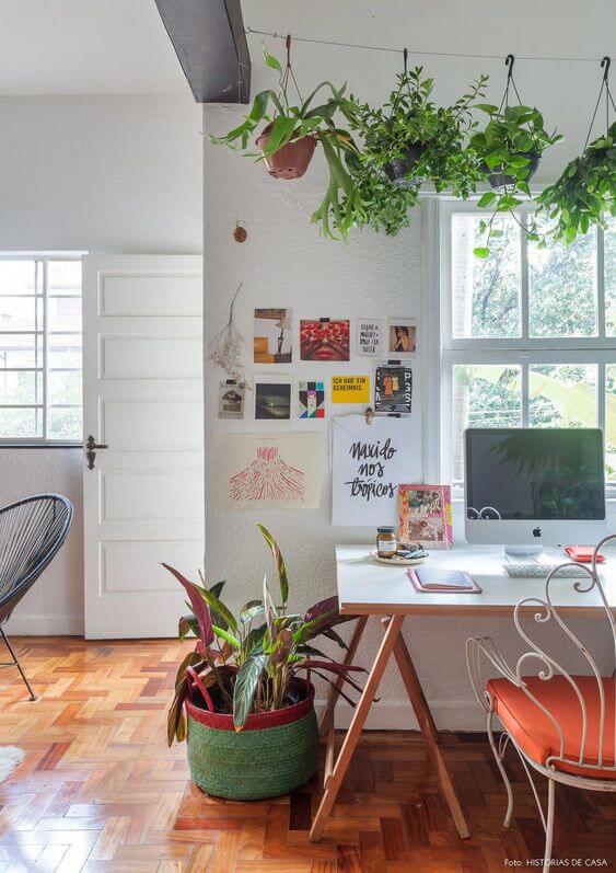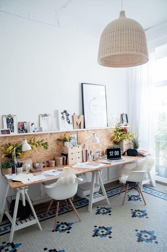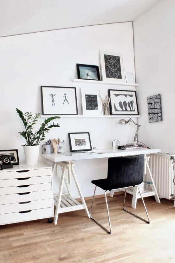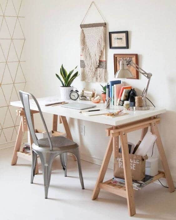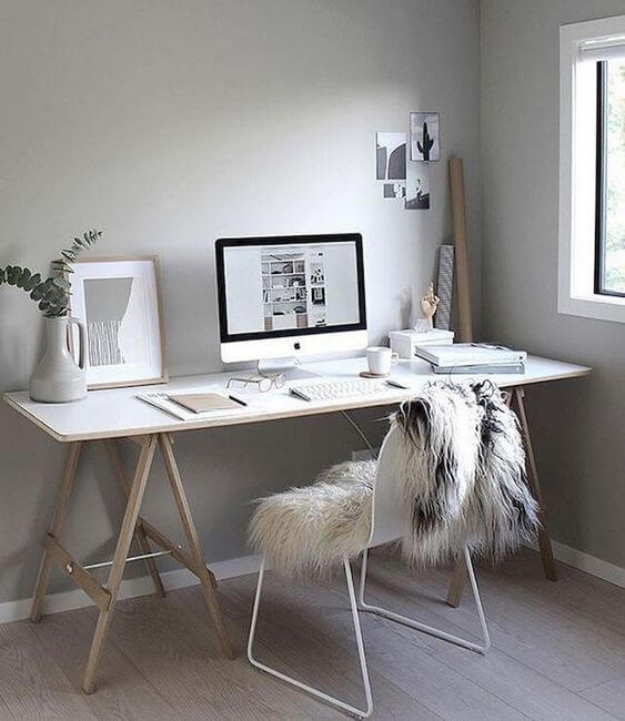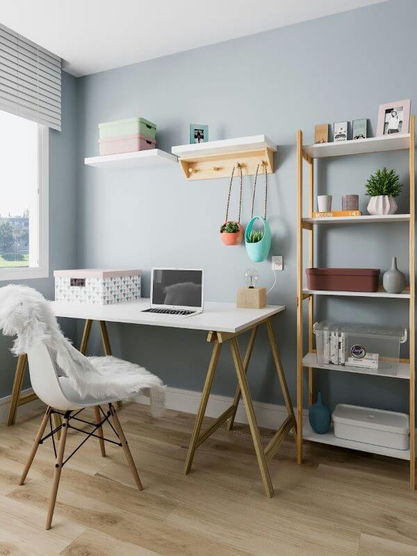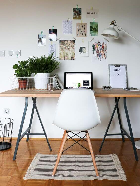 Dica especial: Prefira cores claras e que sejam a sua cara para compor o escritório. A mesa cavalete branca, por exemplo, assim como as cores neutras, são perfeitas para isso. Também repare que o escritório foi decorado com plantas para ser ainda mais relaxante e agradável.