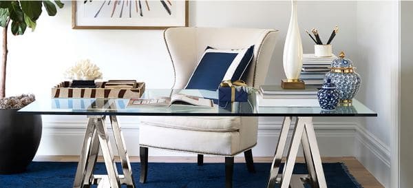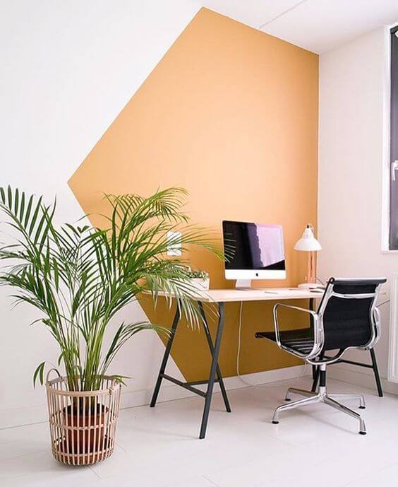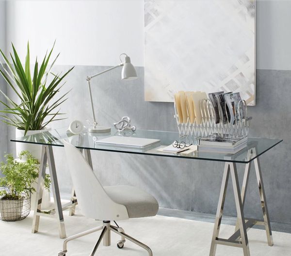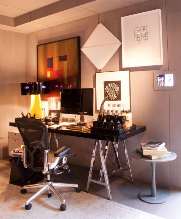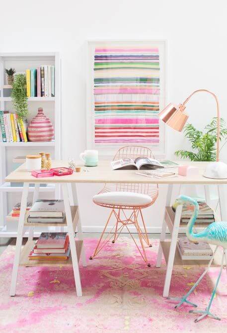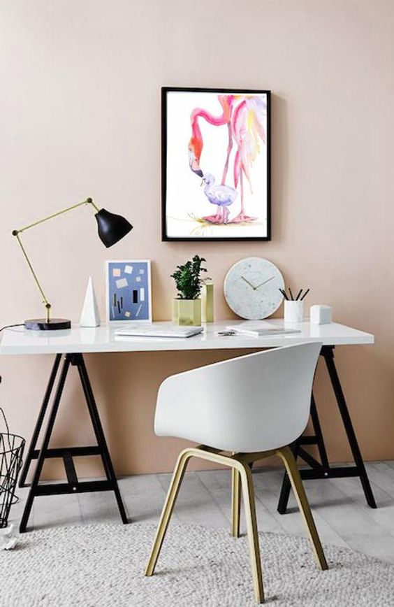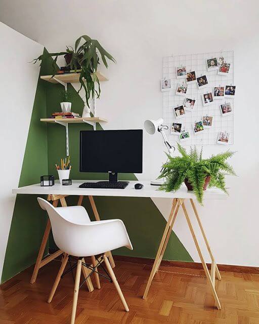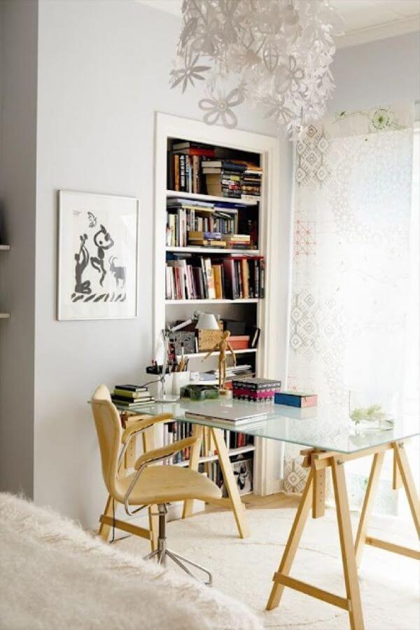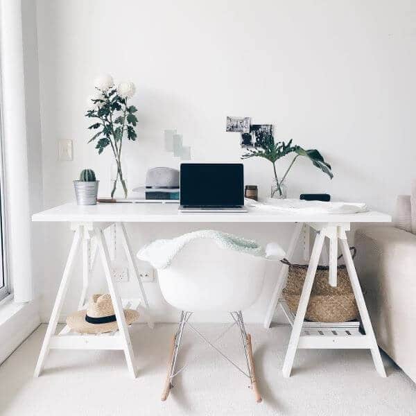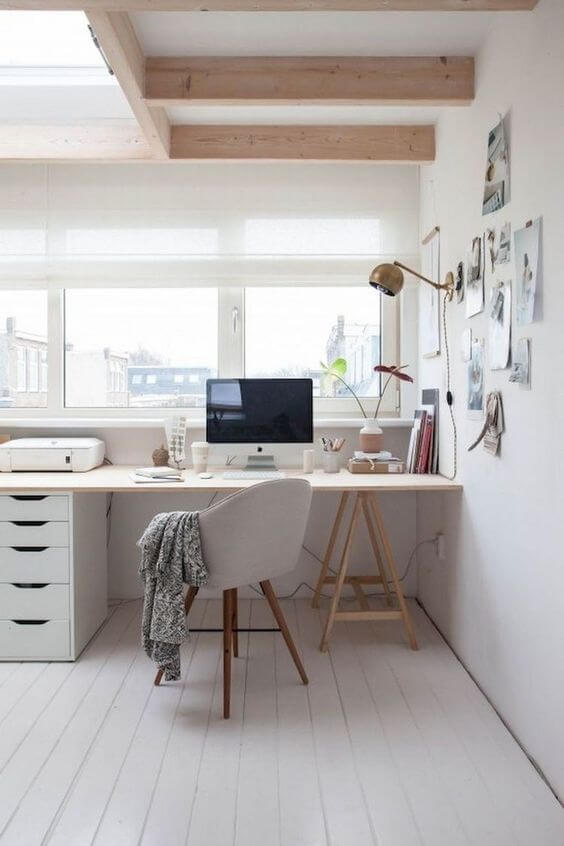 Dica especial: Prefira cores claras e que sejam a sua cara para compor o escritório. A mesa cavalete branca, por exemplo, assim como as cores neutras, são perfeitas para isso. Também repare que o escritório foi decorado com plantas para ser ainda mais relaxante e agradável.