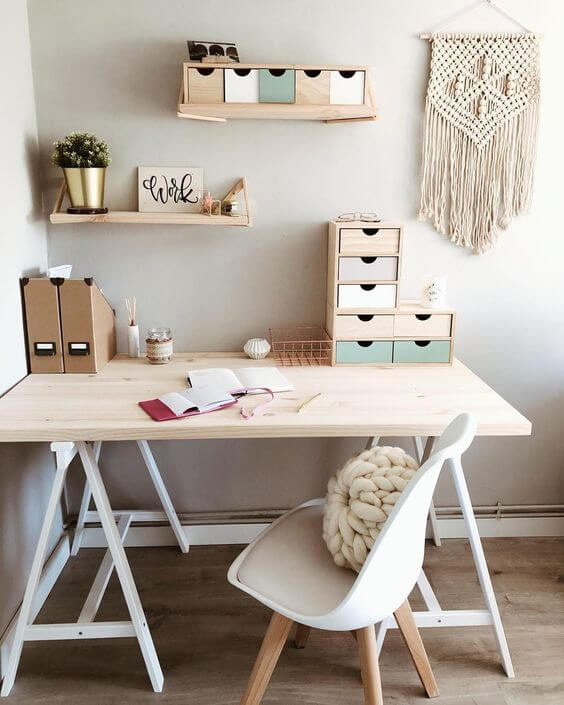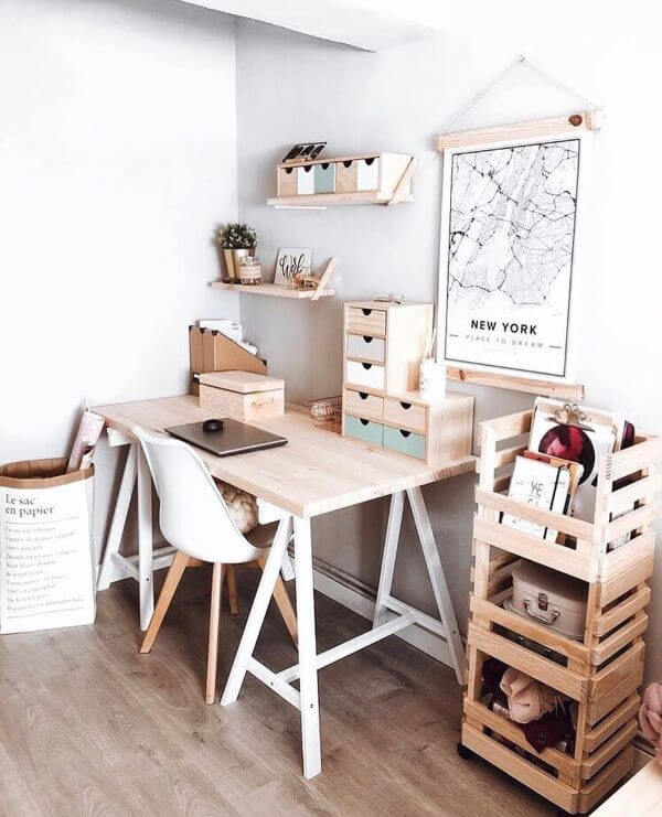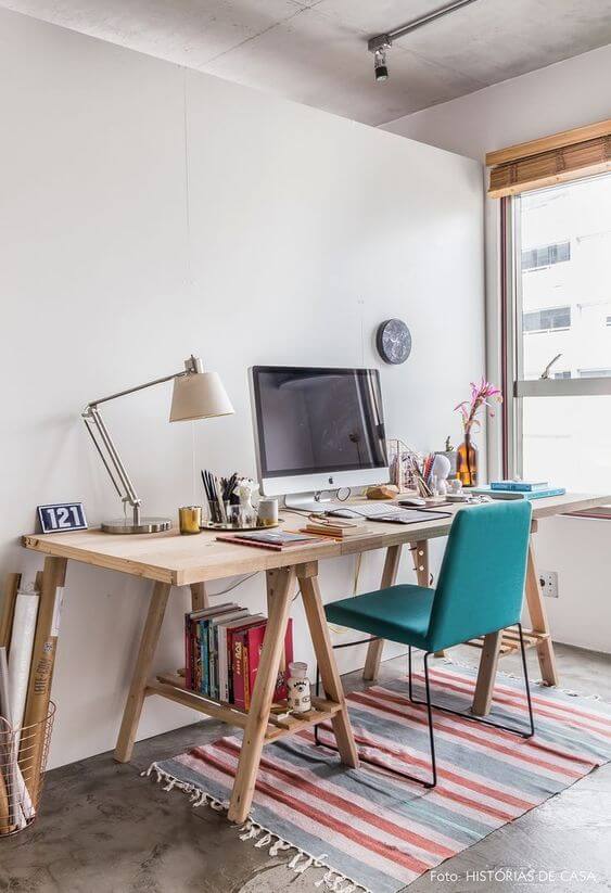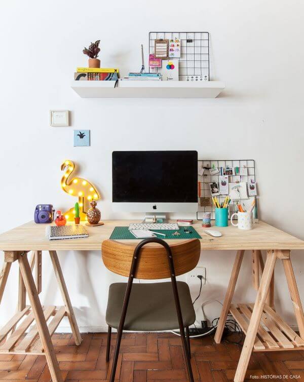 O cavalete pode se tornar uma ótima opção de apoio para seus pertences, mas, caso você precise de mais espaço, vale a pena comprar (ou você mesmo fazer) uma mesa escritório cavalete com um dos lados com gaveteiro organizador. Assim fica mais fácil de se organizar no dia a dia.