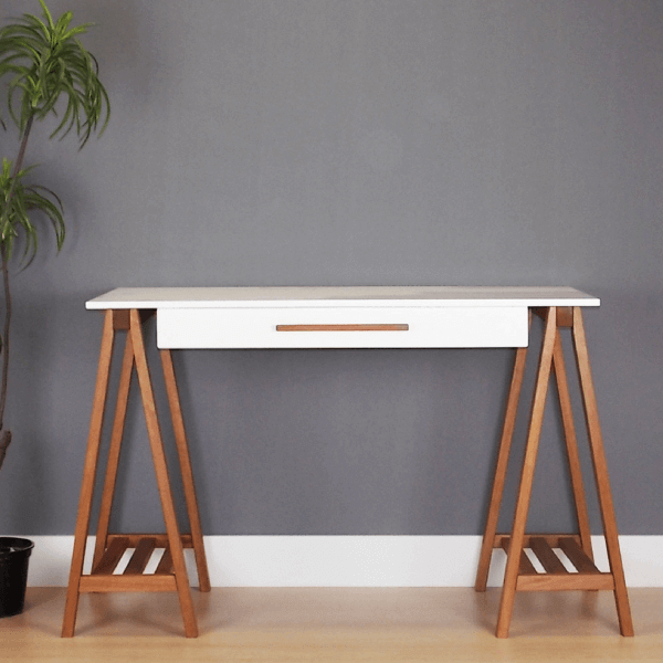 Você pode usar a mesa cavalete em diferentes cômodos. Por ser uma mesa simples e pequena, ela é mais indicada para escritórios ou como uma escrivaninha no quarto. Mas quem está precisando de uma mesa econômica para decorar a sala de jantar, também pode usar a mesa com cavalete – assim como quem está precisando uma rack nova. Enfim, são infinitas possibilidades.