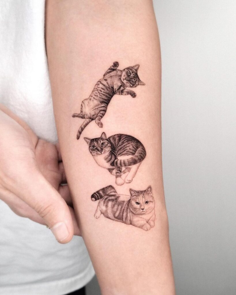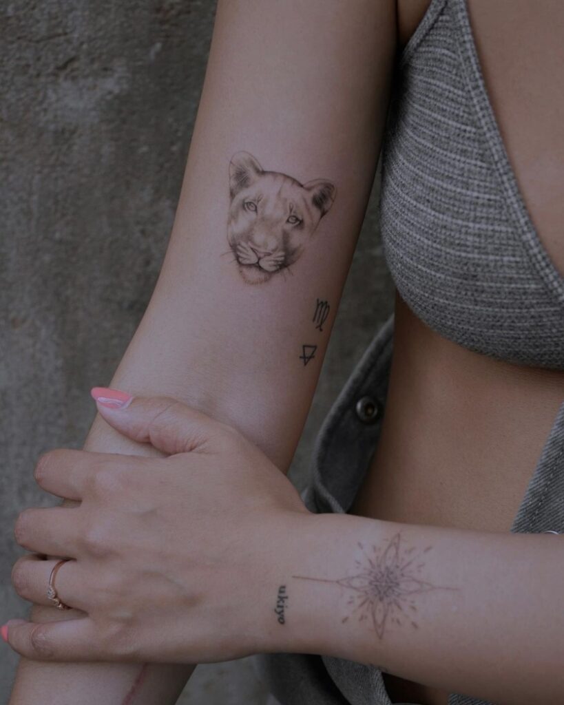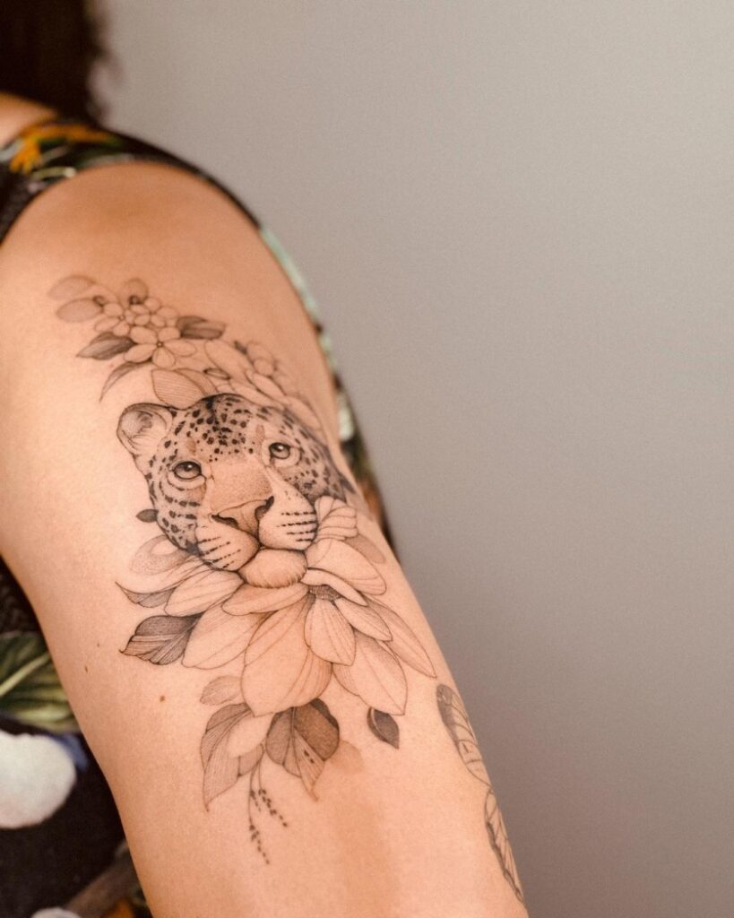 - Tatuagem de animais: o significado varia de animal para animal. Por exemplo, o leão é símbolo de força e coragem, já um peixe é sinônimo de abundância e prosperidade. Outra ideia é eternizar seu pet de estimação, que carrega um significado único para cada pessoa.