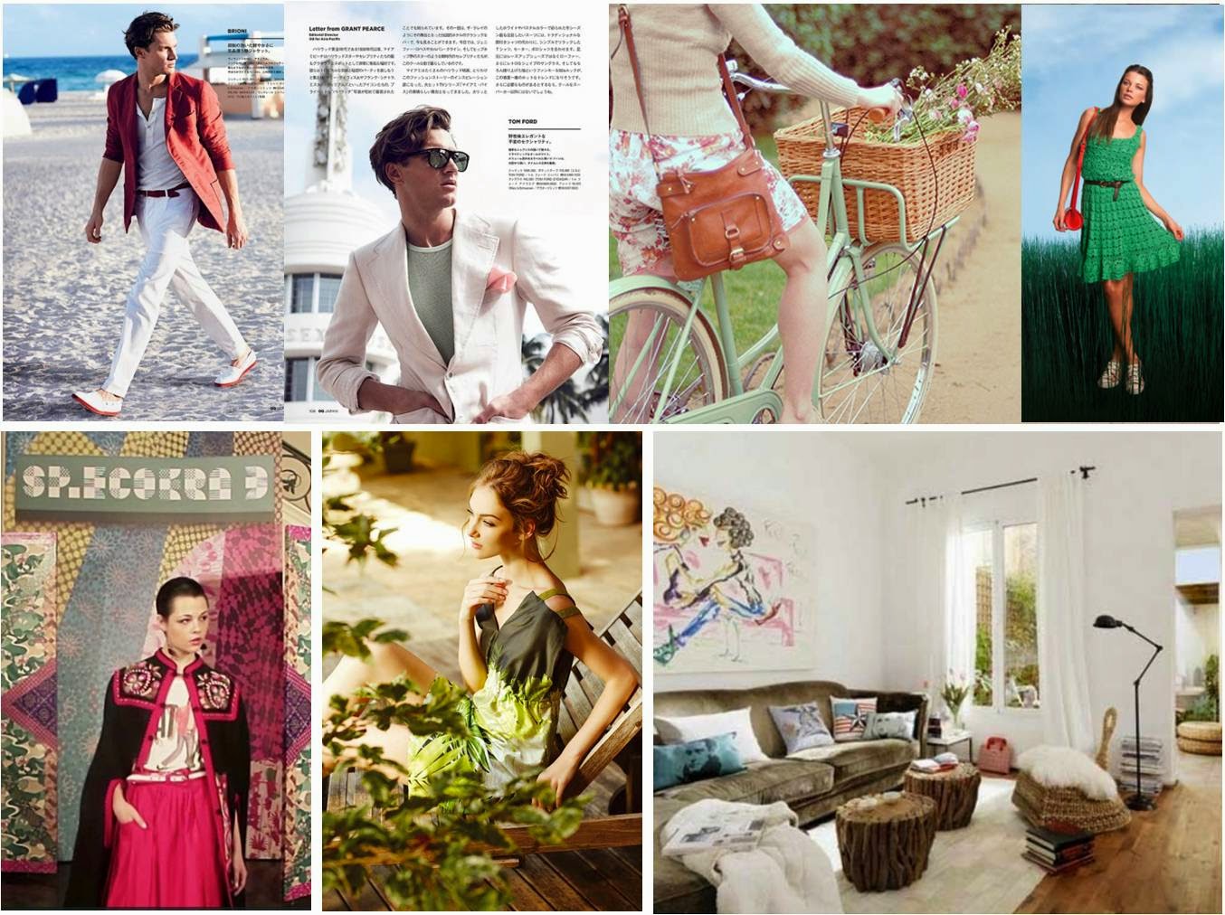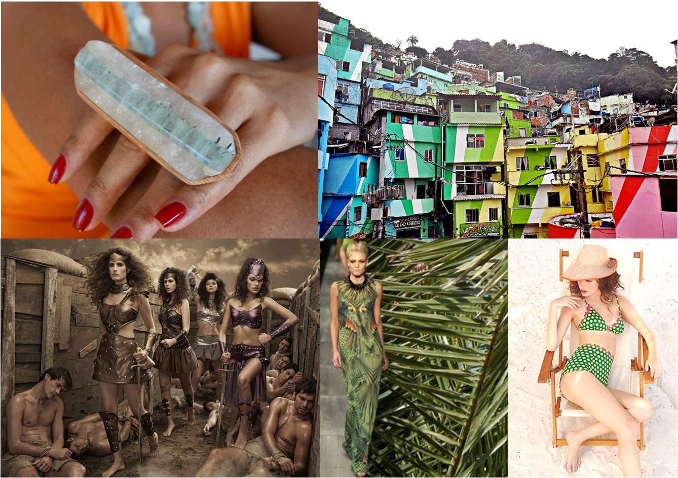 Tropicalismo Étnico – a presença da cor verde bandeira será forte e também de animal print com folhagens. Índios estilizados, tricô com pontos mais abertos como se representassem redes, materiais que remetam aos animais silvestres, estampas que imitem a madeira nas roupas a exemplo do que é feito com os materiais usados na decoração. Amarrações para sandálias e rasteiras, tear, tranças. O vestido é a peça-chave dessa tendência, além do forte contraste de cor. Lingerie coloridas, de verde, é claro! E com estilo anos 20 e luxuosas. Para os homens, o underwear pede peças mais divertidas para sair do comum, pois eles não tem medo de cores e querem estampas de flores, folhagens etc. No life style masculino o destaque serão as camisas havaianas (tendência na qual as mulheres pegaram carona). O short deles também vai ficar mais curto e teremos fortes referências de elegância da moda africana, mais especificamente do Quênia. Para os adolescentes há o resgate das cores violeta e amarelo, muito usadas nos anos 1980. No segmento infantil, as roupas tendem a ser mais lúdicas e com modelagem feita especialmente para os corpos pequeninos. As bolinhas (póas) e o lúdico serão tema para as crianças.