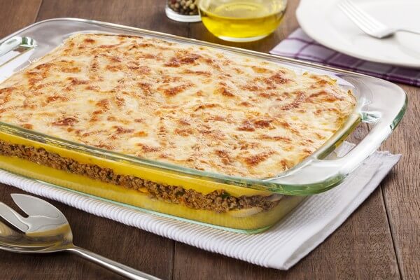 Em um refratário levemente untado com óleo, coloque metade do purê, a carne e cubra com o restante do purê.