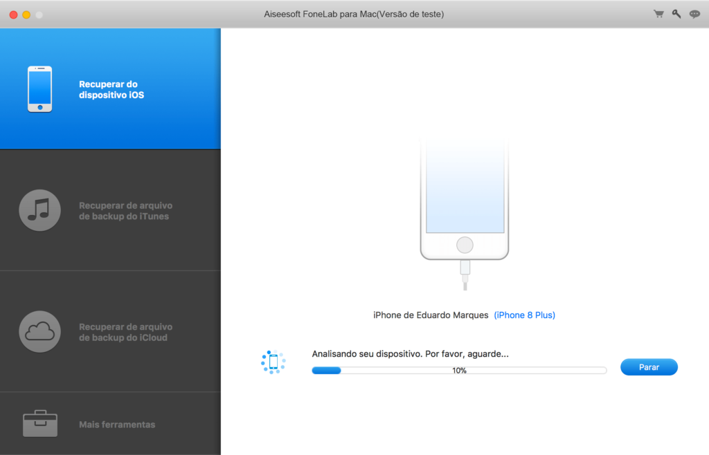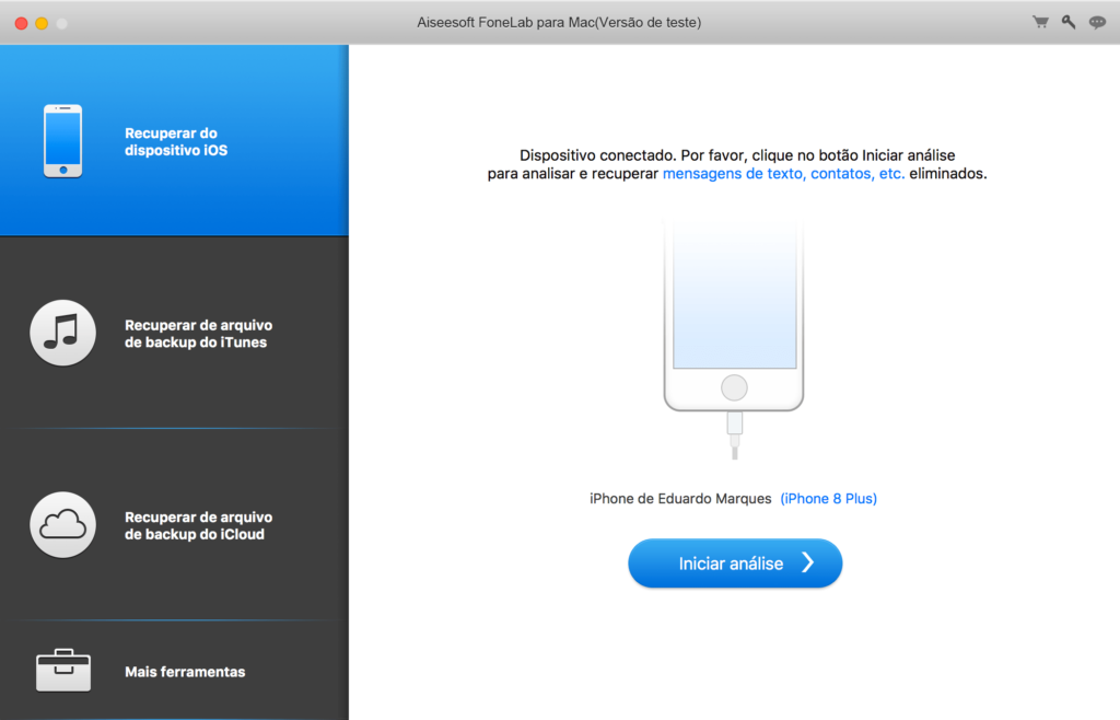 O primeiro passo é conectar o celular seu iPhone ao Mac/PC com um cabo USB. Depois, escolher como quer a recuperação: diretamente do aparelho ou a partir de um backup (iTunes ou iCloud). No exemplo, escolhemos diretamente do celular, já que é muito comum uma pessoa nunca ter realizado um backup. Será necessário, então, baixar um plugin (somente para iPhones 4 e 3GS), mas é só seguir as indicações no próprio programa.
