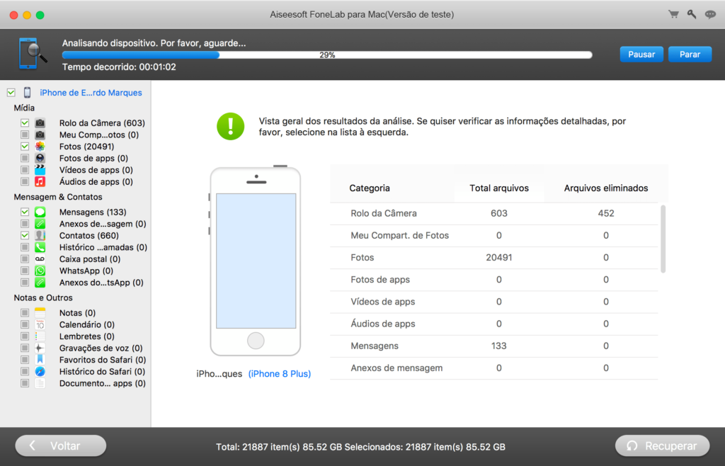 Depois disso, é iniciado um escaneamento, um processo que demora alguns ou muitos minutos — tudo, é claro, depende da capacidade de armazenamento do seu iPhone. O app mostrará uma visão geral dos arquivos presentes no dispositivo. Na barra da esquerda, navegue pelos arquivos e selecione os que deseja recuperar.