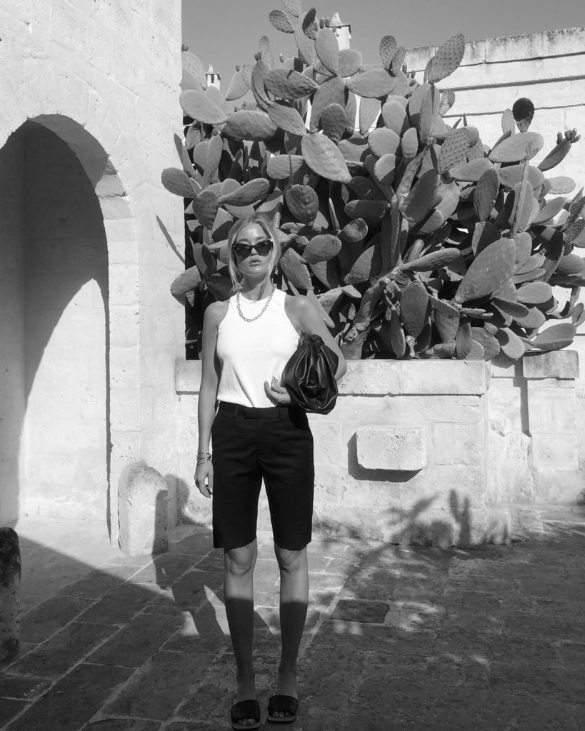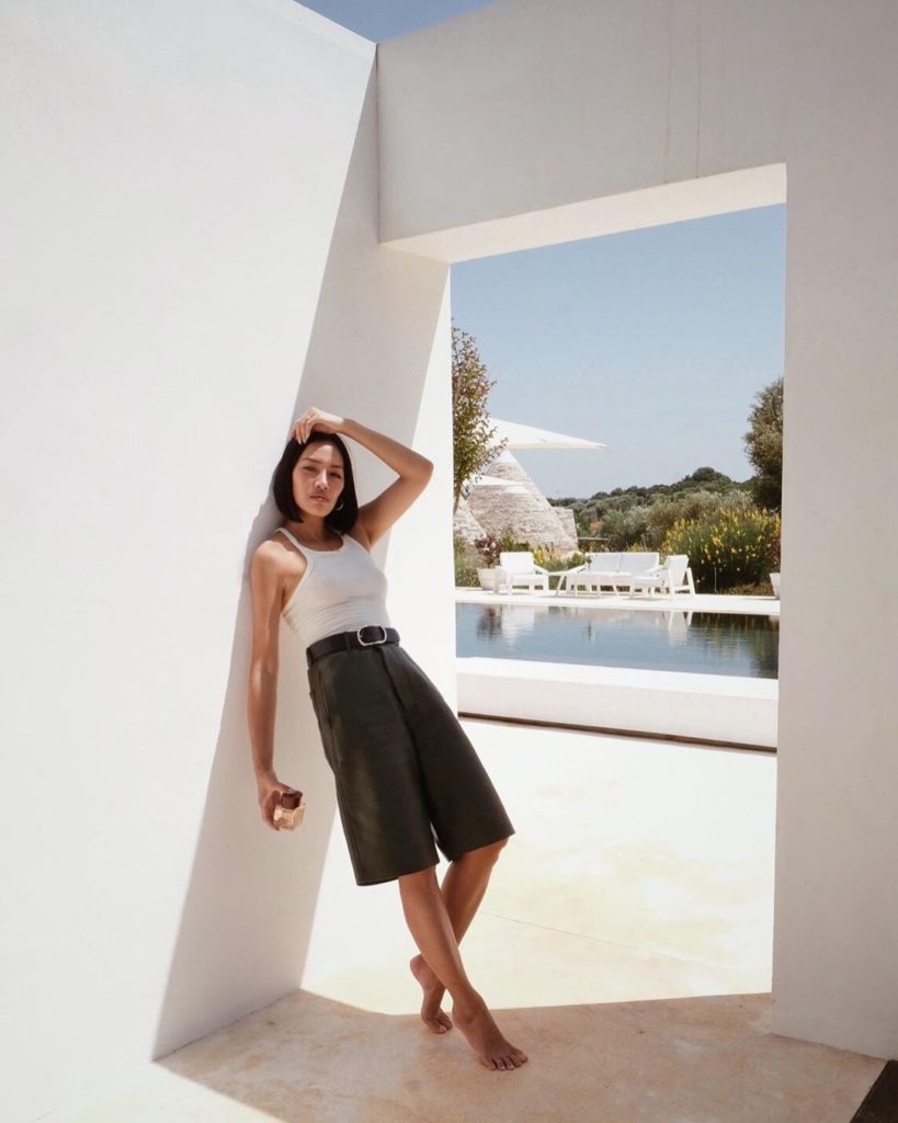 O segredo para atualizá-la é, ao invés de usá-la para quebrar looks supercoloridos, estampados ou esportivos, incorporá-la em looks bem minimalistas e em tons neutros. Das peças favoritas para combinar com a regata branca? A bermuda de alfaiataria. Bem 90’s!
